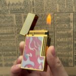A bold reinterpretation of camouflage, the S.T. Dupont Ligne 2 Camo Lighter blends luxury with contemporary flair. Finished in palladium and enhanced by the Guilloche under lacquer technique, it features a red and green flame motif that sets it apart. The signature “Cling” sound on opening and precise yellow flames offer both style and function.